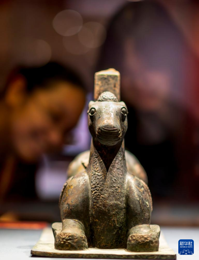 这是展出的人形青铜镇(4月29日摄)。