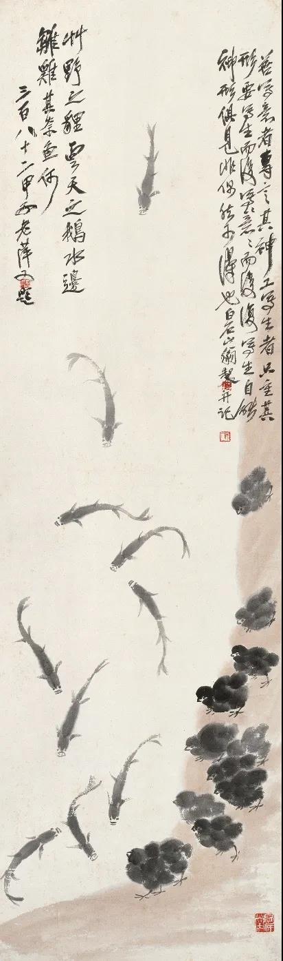雏鸡小鱼纸本墨笔轴 134.5cm×33.5cm 无年款