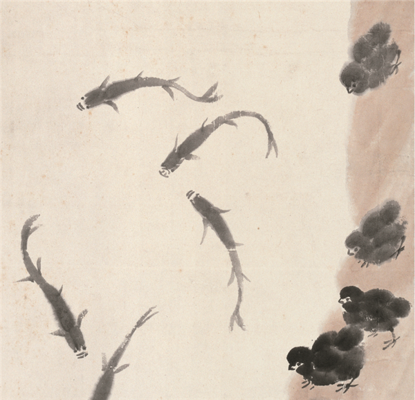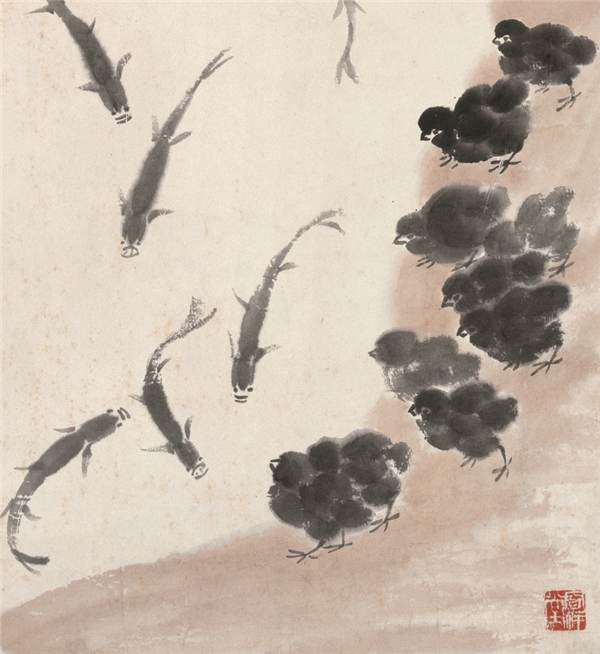 一群毛茸茸的小鸡好奇地伫立在河岸边,鱼儿悠然地在水中嬉戏。小鸡看着鱼儿好像在流口水,但因无法下水,只能在岸上着急。这幅幽默生动的画作是齐白石1926年创作的《雏鸡小鱼》图,适值齐白石64岁,是其花鸟画成熟的前后时期。