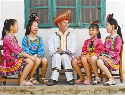 图为谢庆良(中)在教村里的孩子唱山歌。 新华社记者 陆波岸摄
