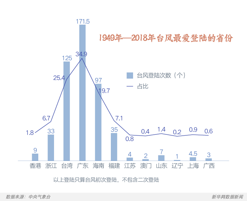 编辑:申敏夏 马璐璐 设计:姜子涵 2019-08-09 14:44:21 来源: 新华网据中央气象台消息,今年第9号台风“利奇马”(超强台风级)10日凌晨到上午将登陆浙江。8月,台风进入活跃期,今年第8号台风“范斯高”、第9号台风“利奇马”、第10号台风“罗莎”相继出现。台风为何扎堆出现?全国哪些省市最爱“招惹”台风?本文通过对1949年至2018年492个台风、631次登陆(含二次及以上登陆情况,登陆强度均为热带风暴级或以上)进行了统计,让数据告诉你台风最爱登陆哪里。