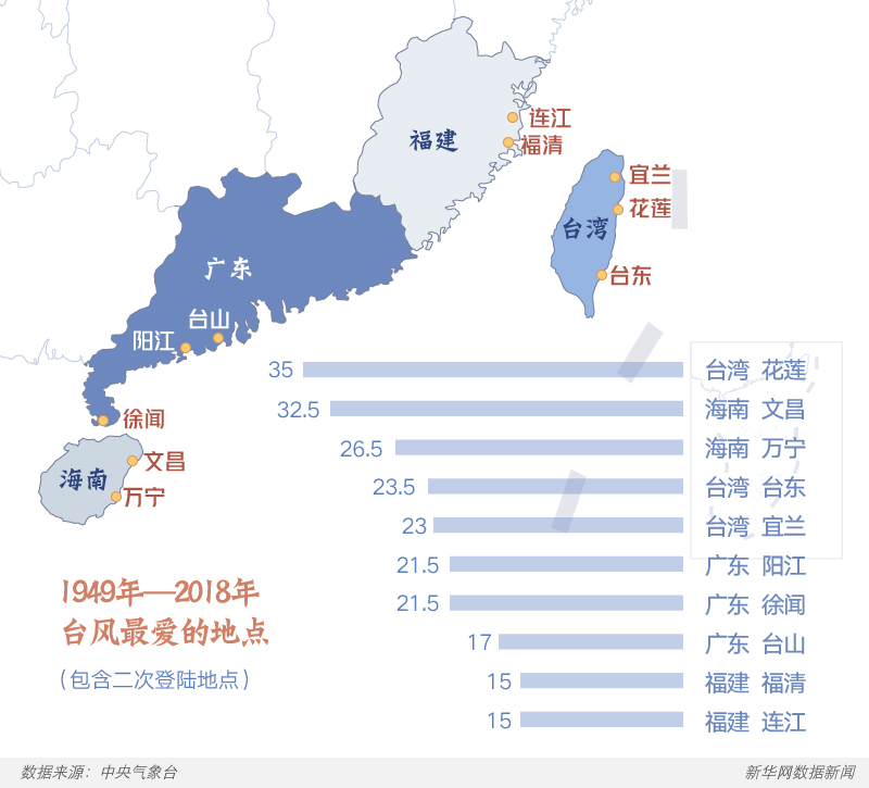 如果更精确一点,加上二次登陆的台风,比如先登陆台湾后,又在广东、福建登陆都算上的话,福建也占据了第九和第十名,在台风最爱登陆地点的TOP10榜上有名。