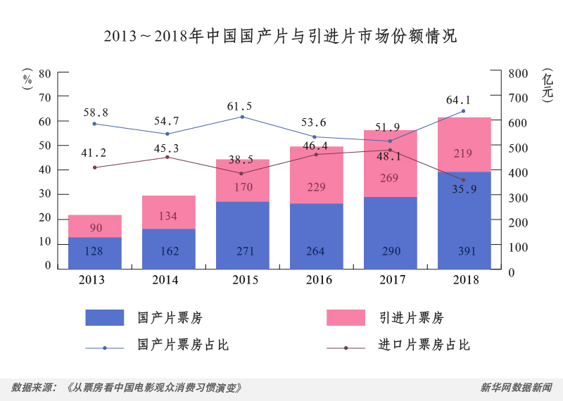 国产片与进口片的竞争由来已久,来自“猫眼电影专业版”的数据,2014~2018年,每年票房前10位的影片中,国产片共29部,票房为532.77亿元;进口片为21部,票房为315.31亿元。从近5年数据来看,无论是数量上还是票房上,国产片均超过了进口片,票房占比为63.5%和36.5%。