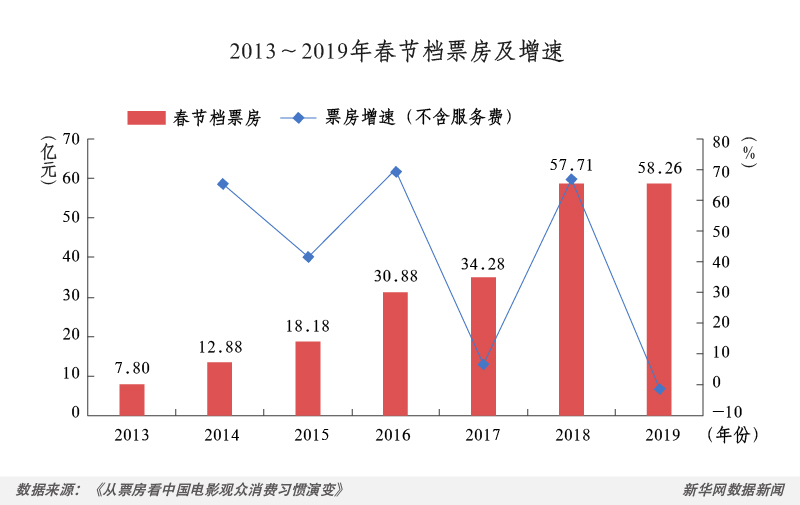 自2013年起,春节档票房持续走高。从2013年的7.8亿元到2019年的58.26亿元,增长了将近6.5倍,尤其是2017~2018年,票房出现了70%大幅度增长,春节档上座率远远高于日常。