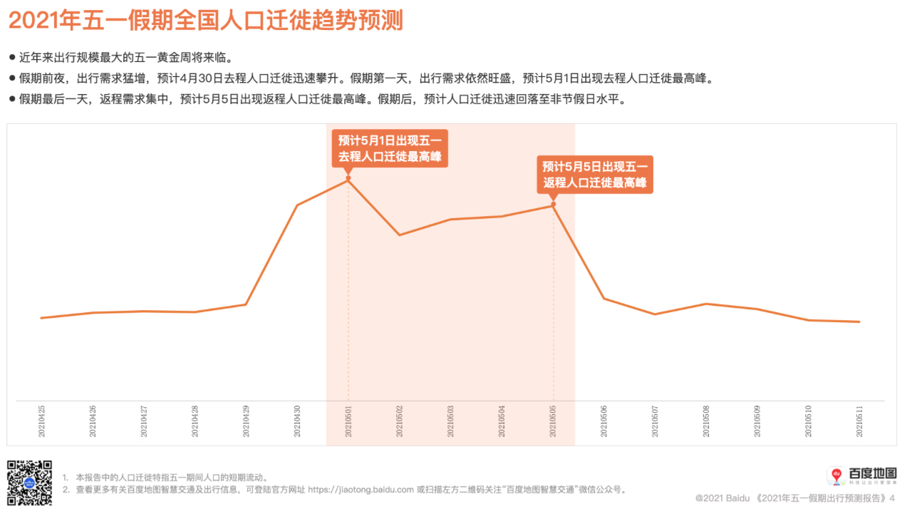 今年“五一”假期继续延续“加长版”,5天长假点燃了众多消费者的出游热情。根据中国旅游研究院的预测,今年“五一”国内旅游出游有望达到2.2亿人次,按可比口径甚至超过疫前同期水平。根据百度地图《2021年五一假期出行预测报告》,近年来出行规模最大的“五一”黄金周将来临。预计5月1日出现五一去程人口迁徙最高峰。