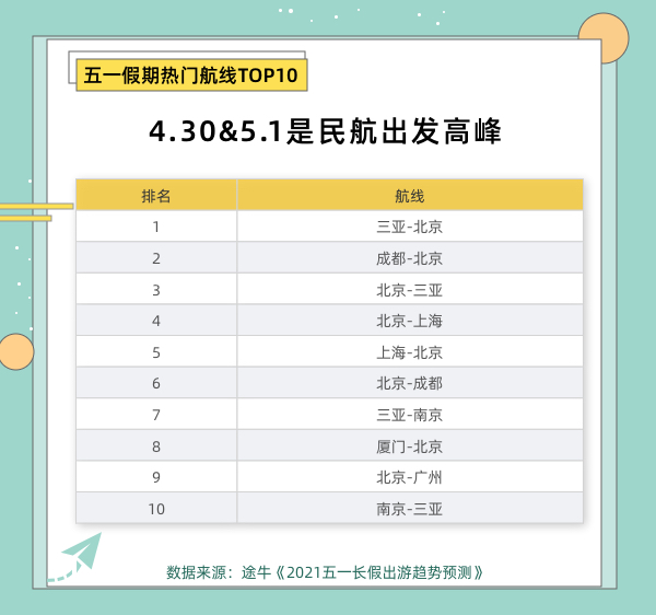 根据途牛发布的《2021五一长假出游趋势预测》数据,在旅游快速复苏、“加长版”假期、旅游优惠活动等多重利好下,今年“五一”计划出游的人数将暴增。出行人数的激增使多条热门航线票价大涨,4月30日和5月1日两天是民航出发最高峰,而返程高峰将出现在5月4日、5日的假期末尾。