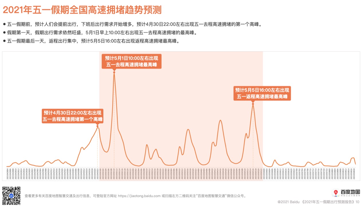 假期前,预计人们会提前出行,下班后出行需求开始增多,预计4月30日22:00左右出现五一去程高速拥堵的第一个高峰。