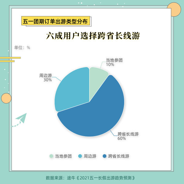 《报告》显示,截至目前,预订出游的订单中,有60%为跨省长线游,其中,有37%的订单行程天数超过5天,拼假出游的游客不在少数。
