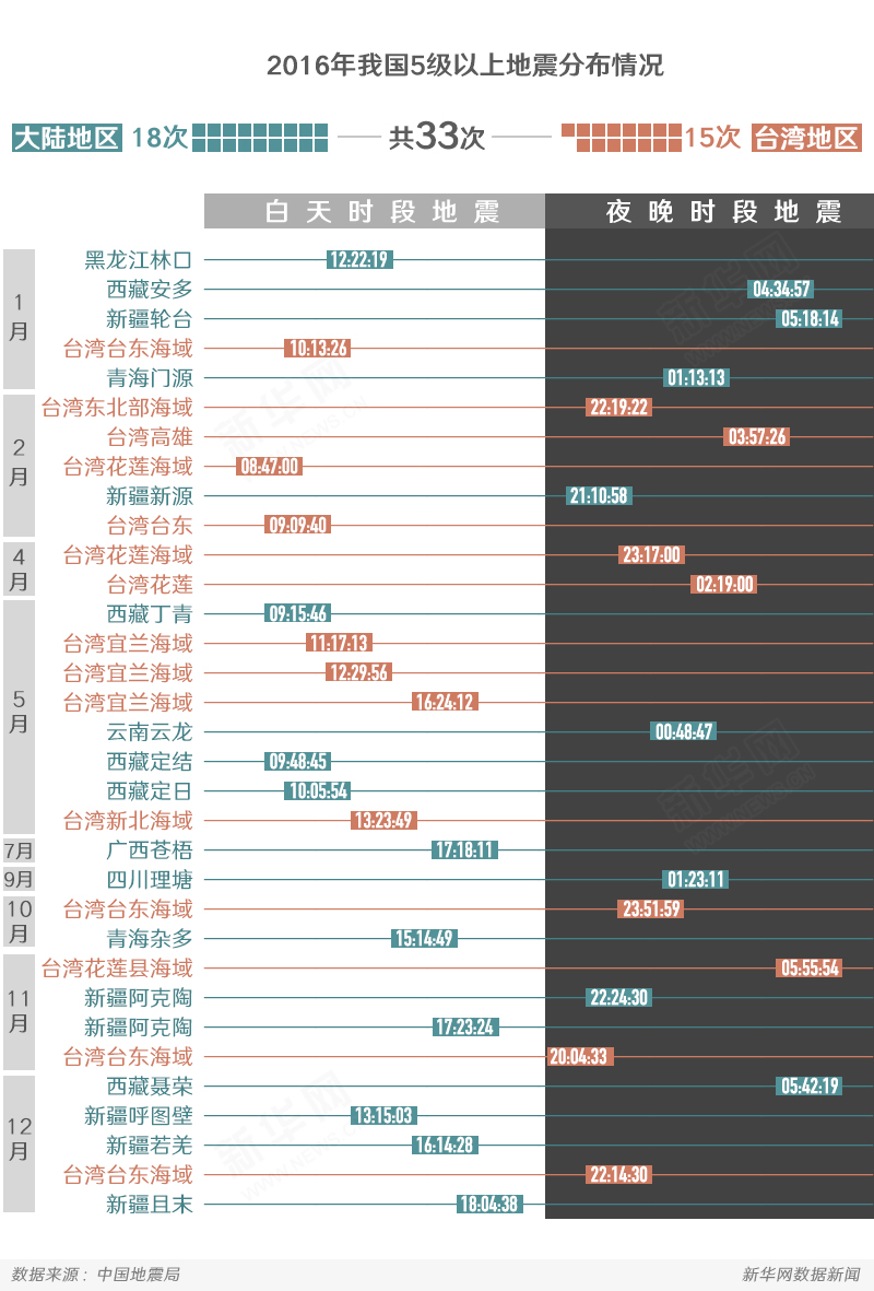 2016年我国共发生33次5级以上地震,其中大陆地区18次,台湾地区15次。