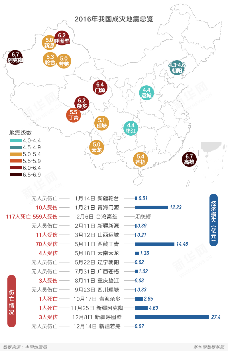 编辑:肖潇 设计:殷哲伦 2016-12-29 09:14:49 来源: 新华网2016年你的手机是否收到过这样的新闻推送:“X时X地发生X级地震,震源X千米,……”,手机的一次震动带来的是一条信息,而地球的一次“震动”,却可能意味着一场灾难。回看2016年我国地震灾害事件,防震减灾工作仍然任重道远。