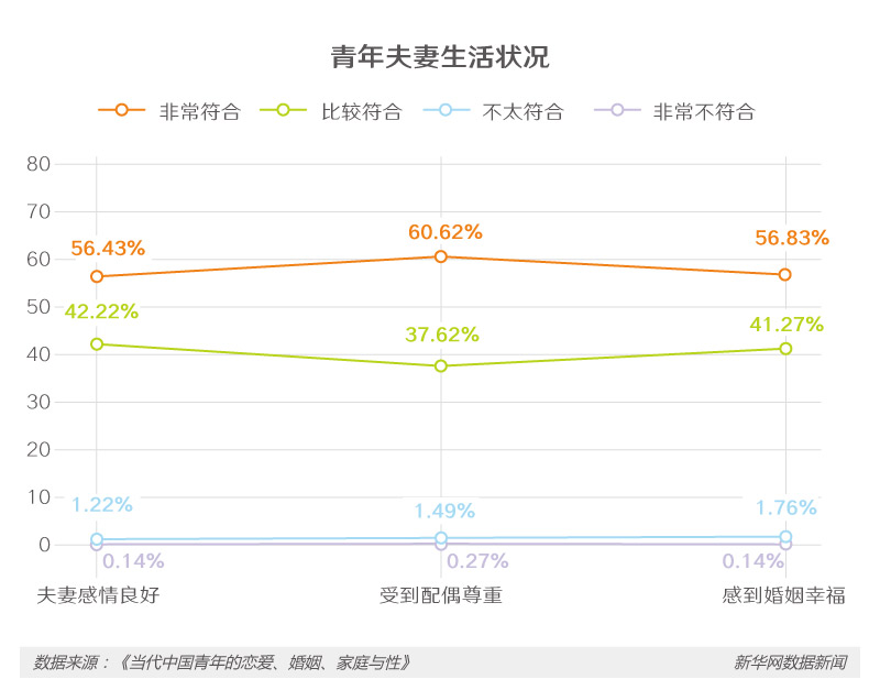 自身的社交网是青年人恋爱择偶最重要途径,相关调查结果显示,在已婚青年中:56.1%的夫妻双方自己直接认识的,另有40.8%是通过亲朋好友介绍相识的。此外,青年夫妻中,认为夫妻感情好、相互尊重、婚姻幸福的比例均超98%。