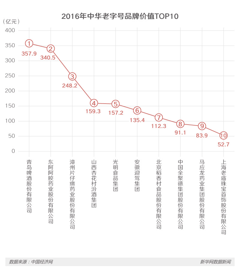 这些老字号品牌得益于政策保护和与时俱进的创新,在今天仍然极具生命力和竞争力,甚至成为行业中的佼佼者。在2016年中国老字号品牌价值排行榜中,青岛啤酒以357.9亿人民币摘得桂冠。