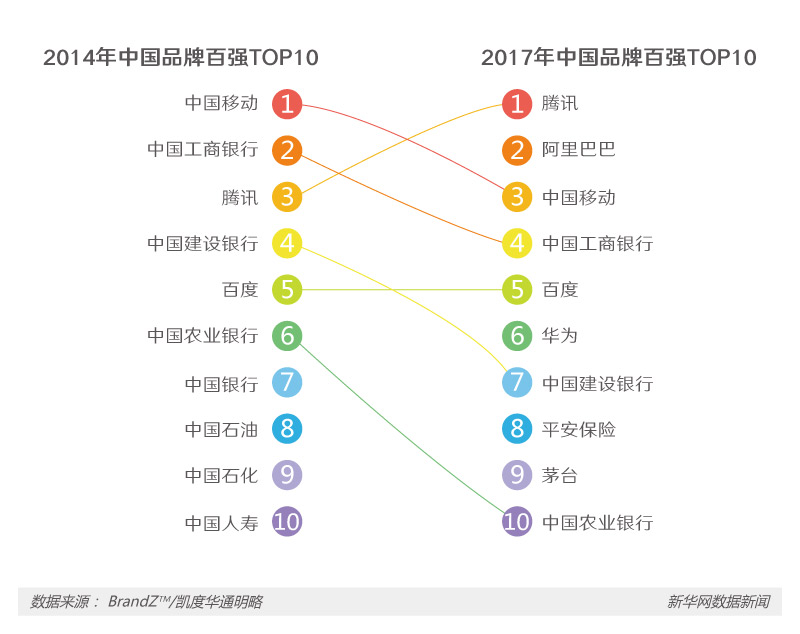 在排名位列前十的中国百强品牌中,传统工业行业正在让位于新兴的科技行业,科技已成为中国经济的新驱动力,“互联网+”也让新零售也大放异彩。同时,在排名前十的品牌中,所属行业和所有制种类越来越多元,其背后是中国经济市场化改革成果和市场活力的体现。