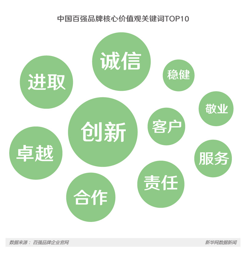 中华老字号传承百年有其坚守,在传承中不断创新,诚信严谨,追求卓越品质;品牌新星上榜百强有其专长,稳健中开拓进取,用人才、重服务,讲诚信、担责任。不管是老字号还是百强企业,透过各家官方网站上关于企业文化的相关介绍我们可以发现,“创新、诚信、卓越、进取”的共同价值观是中国品牌永不褪的底色。