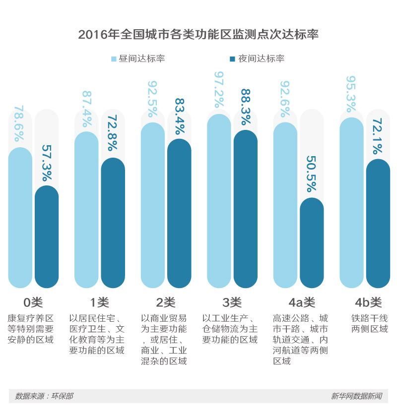 在本应万籁俱寂的夜晚,噪声的问题往往显得尤为明显。2016年,全国共有309个地级及以上城市报送了功能区声环境质量监测数据,各类功能区共监测昼间、夜间共21624点次。其中,昼间总点次达标率达92.2 %;夜间总点次达标率为74.0%。