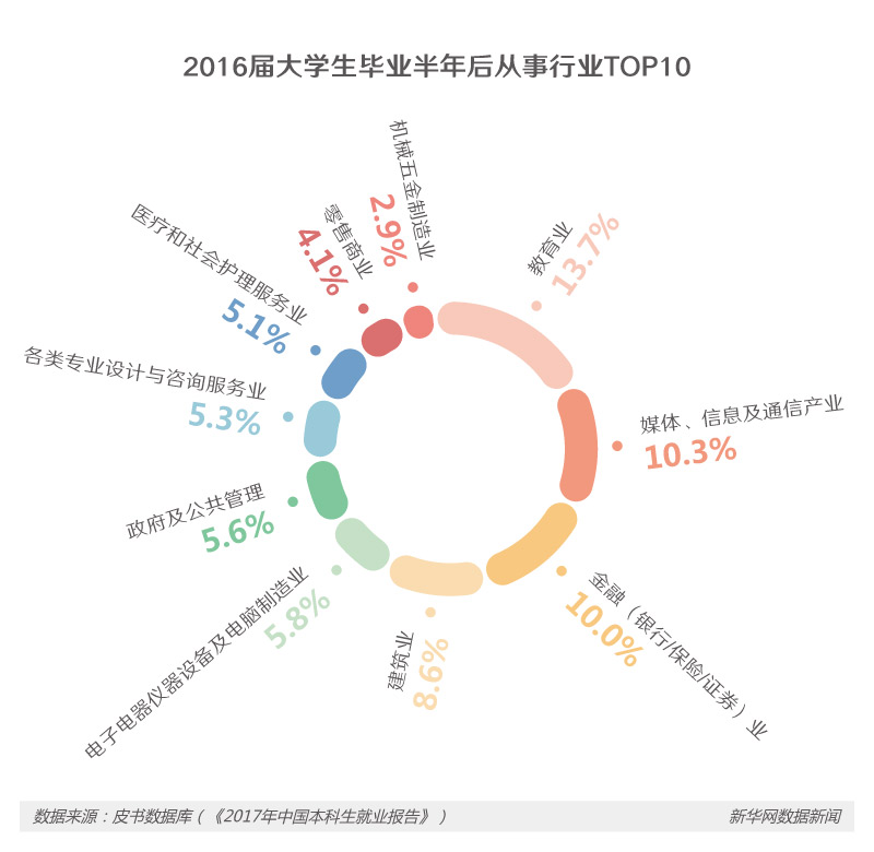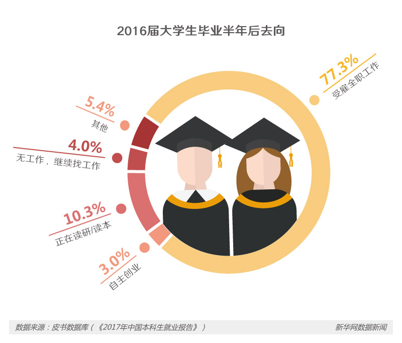 编辑:肖潇 设计:姜子涵 2017-06-16 09:15:45 来源: 新华网又是一年毕业季,大学生找工作也进入了“冲刺阶段”。那么,目前应届本科毕业生的就业情况如何?哪些行业最受热捧?就业与创业,大家又选择了何去何从?透过最新的调查数据,一起来一探究竟。