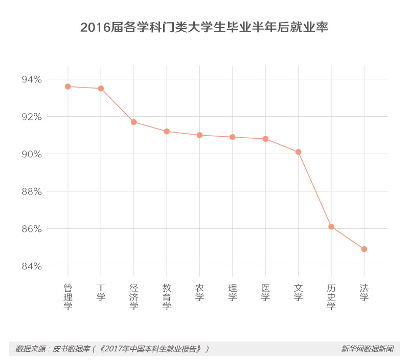 民间曾有云,“学好数理化,走遍天下都不怕”,从数据来看,这句话放在现在似乎多少还算有些道理——从2014届到2016届的就业率变化趋势来看,本科学科门类中,理学毕业生毕业半年后的就业率持续上升,医学、文学、法学毕业生毕业半年后的就业率持续下降;此外,2016届本科生毕业半年后就业率前三位的专业分别是软件工程、工程管理和建筑环境与设备工程。