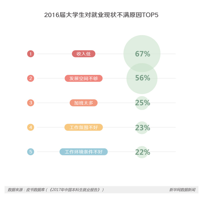 找工作重要,找一份顺心的工作更重要,根据调查结果显示,2016届大学毕业生的就业满意度为65%, 比2015届高出3个百分点。“收入低”和“发展空间不够”是毕业生对就业现状不满意的最主要原因。