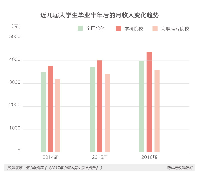 说到收入问题,虽然近几年大学毕业生的月收入逐年增加,但毕竟实际收入赶不上期待收入。当前,大学毕业生总体的期望薪酬为4211元,比毕业半年后实际月收入(3988元)高出200多元。