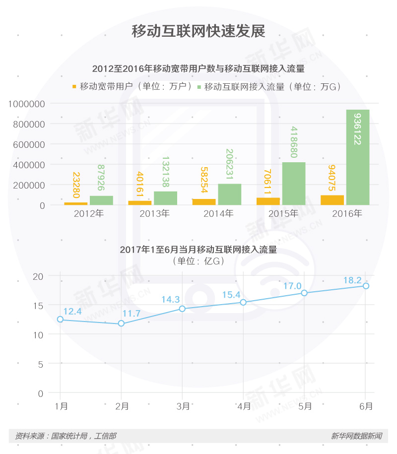 编辑:新华社国内部 设计:新华网数据新闻 2017-08-09 13:05:44 来源: 新华网国家统计局的最新数据显示,上半年移动互联网累计流量达88.9亿G,同比增长136.8%。业内预计年底将超百亿G。工信部的统计显示,11.7亿移动互联网用户,6月份户均接入流量近1.6G,是2015年同期的4倍多;庞大流量规模催生多种新业态,撬动庞大就业市场……