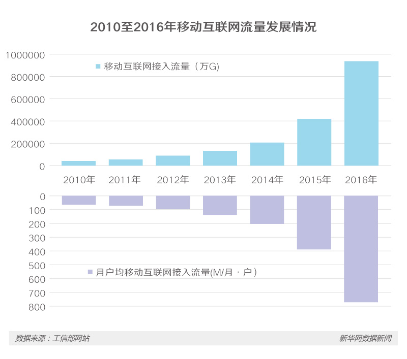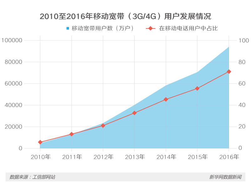 中国已经迎来“移动时代”,电话用户规模在不断扩大,以2016年为例,移动电话用户净增5054万户,总数达13.2亿户,移动电话用户普及率达96.2部/百人;4G用户数也呈爆发式增长,全年新增3.4亿户,总数达7.7亿户;此外,宽带城市建设继续推动光纤接入的普及,光纤接入用户占比也明显提升。随之而来的,是移动互联网流量增速的加快,2016年移动互联网接入流量消费达93.6亿G,同比增长123.7%。