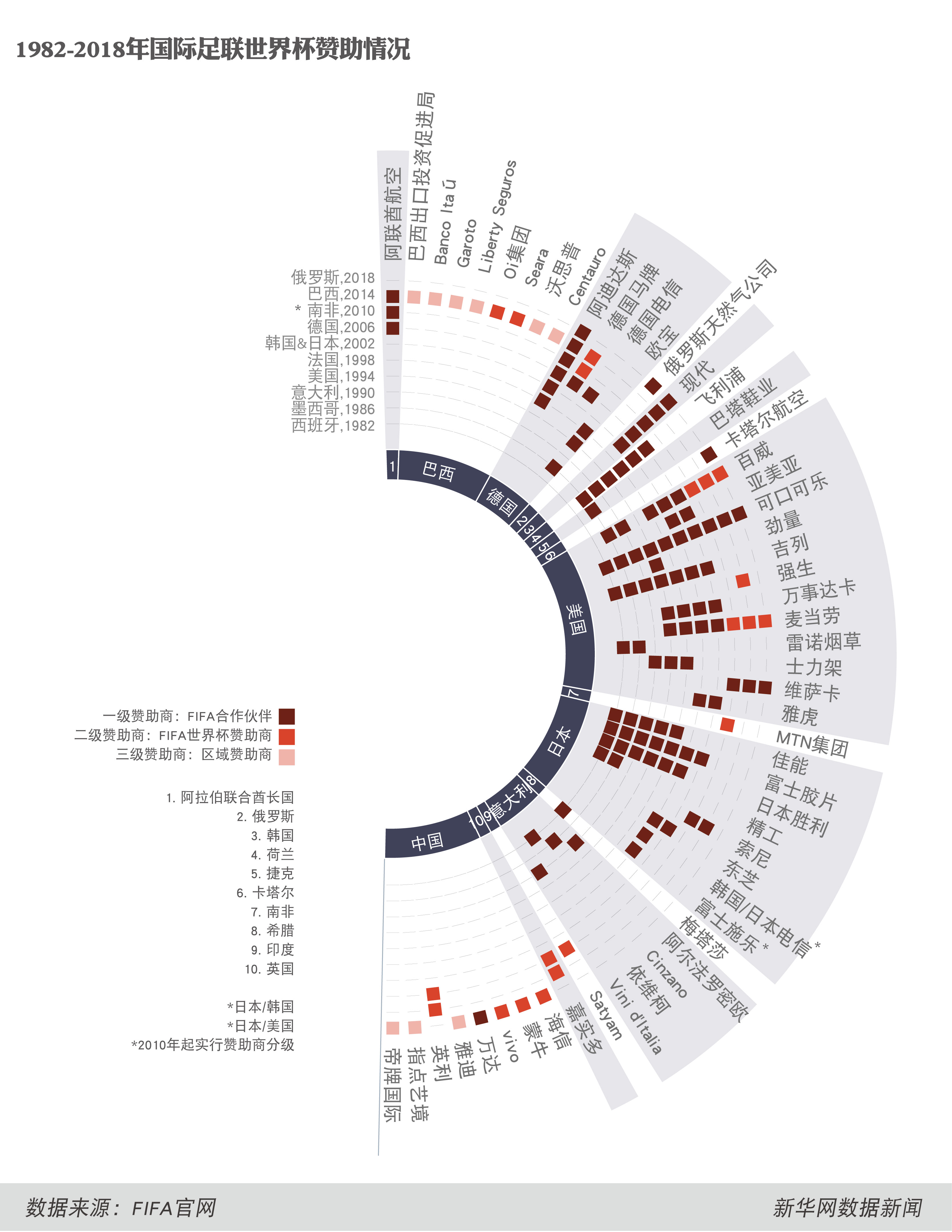 中国企业踏足世界杯,不过是近三届的事情。从1982年至今,赞助商更多是来自足球强国、发达国家和举办国当地:这期间,共有12家美国企业赞助过世界杯,此外,还有来自日本、德国、意大利的重量级赞助商。2014年的巴西世界杯,有八家本土企业赞助了赛事,而此后,巴西企业并未表现出太多赞助热情。