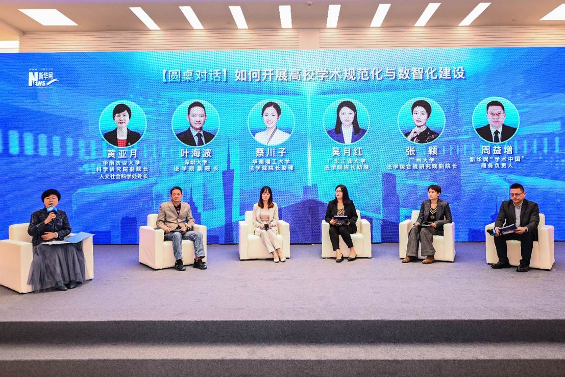 现场圆桌论坛环节由华南农业大学科学研究院副院长、人文社会科学处处长黄亚月主持。来自深圳大学法学院副院长叶海波、华南理工大学法学院院长助理蔡川子、广东工业大学法学院院长助理吴月红、广州大学法学院合规研究院副院长张颖、新华网“学术中国”商务负责人周益增围绕如何开展高校学术规范化与数智化建设等议题,进行了深入研讨。(劳秀燕对本文已有贡献)