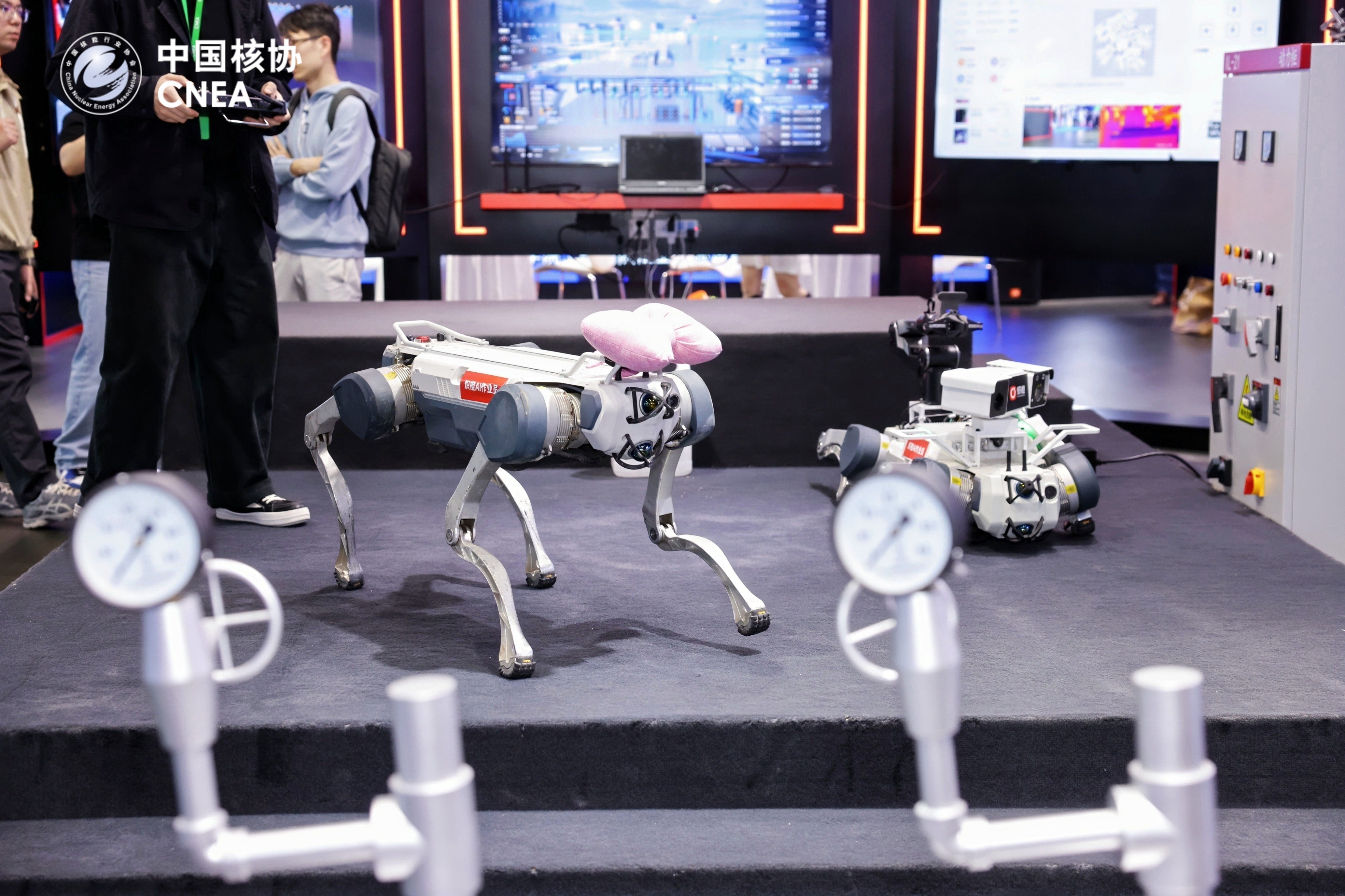 在第十六届中国国际核电工业展览会上,AI驱动的核电机器人也吸引了不少人的目光。现场工程师介绍,该四足机器人搭载了机械臂、传感器等,可以代替人在核电站内进行检测等工作;同时,内置系统通过AI预判施工风险,为作业过程全程保驾护航。