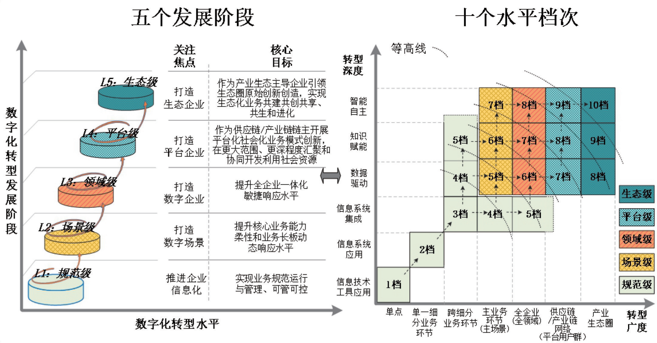 数字化转型的发展阶段和水平档次示意图。来源:《数字化转型管理参考架构》(GB/T 45341-2025)
