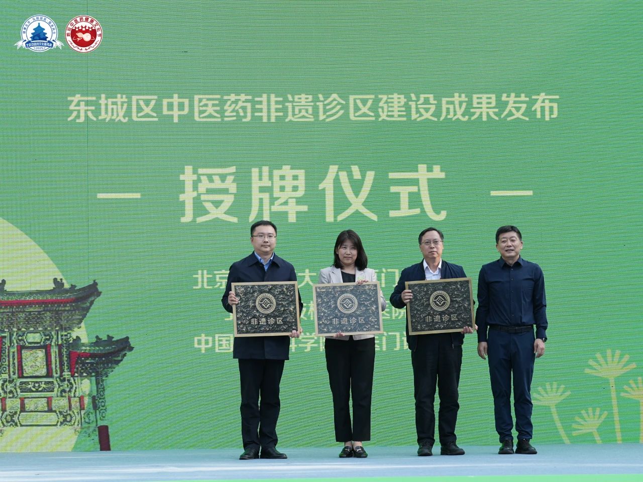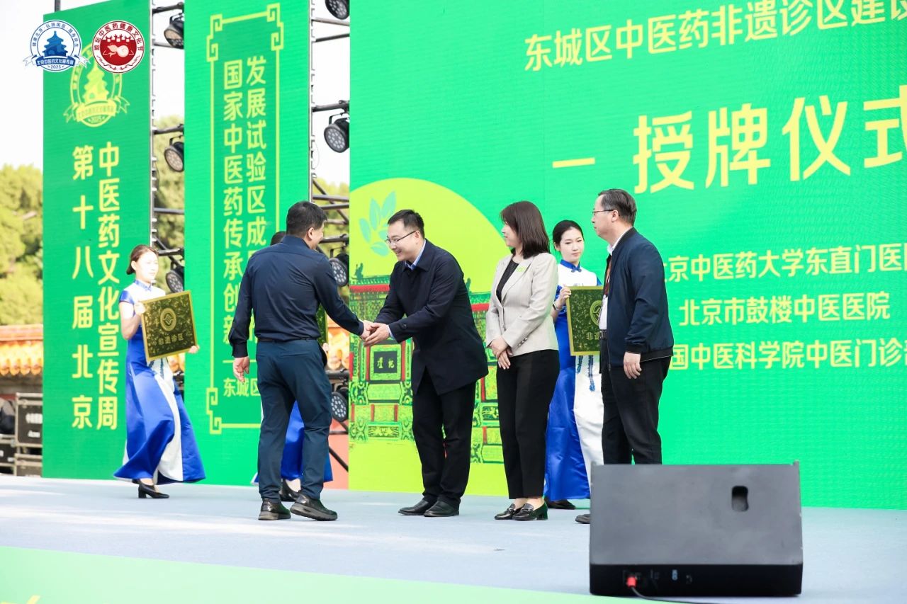 5月23日下午,在第十七届地坛中医药健康文化节开幕式上,东城区政协副主席贾邦为中国中医科学院中医门诊部颁授“中国非物质文化遗产非遗诊区”牌匾,门诊部副主任郑昭瀛参加了授牌仪式。