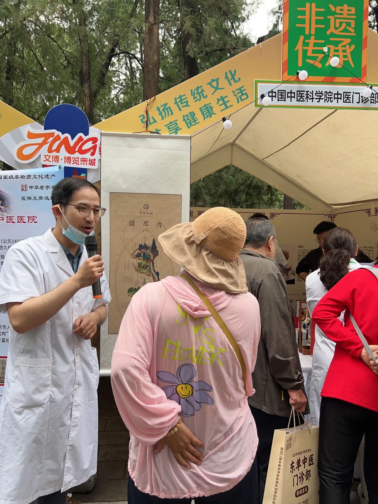 在非遗现场展区,中医门诊部展示了中医生命与疾病认知方法、中医诊法、中药炮制技术三个非遗项目以及曹洪欣、周超凡、王孝涛三位代表性传承人。门诊部针灸科吴思渊医师为市民讲解内经图,传播中医药文化,让更多人群了解和感受中医药理论的魅力,市民积极参与中医药趣味活动、方剂药材辨识活动,现场热闹非凡。