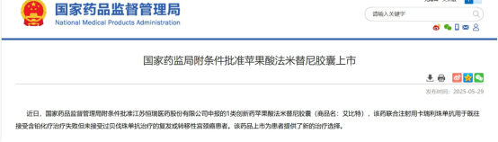 近日,恒瑞医药及子公司苏州盛迪亚生物医药有限公司收到国家药品监督管理局的通知,批准公司1类创新药苹果酸法米替尼胶囊(商品名:艾比特)上市,联合注射用卡瑞利珠单抗(商品名:艾瑞卡)用于既往接受含铂化疗治疗失败但未接受过贝伐珠单抗治疗的复发或转移性宫颈癌患者。目前,恒瑞医药获批上市的创新药已达23款。