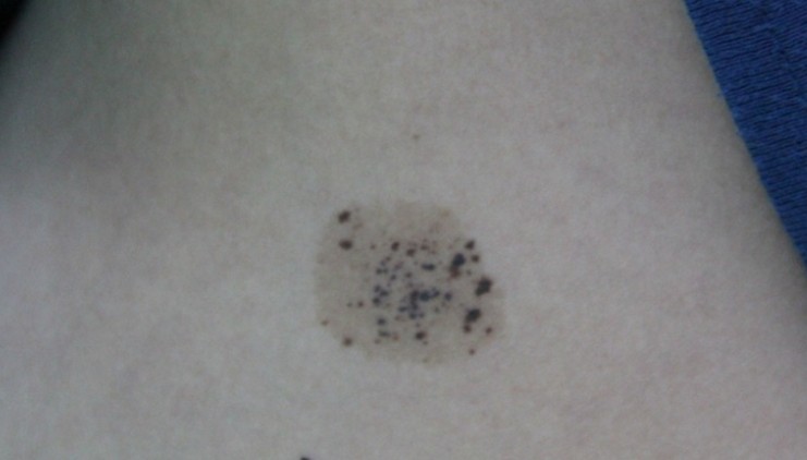 花色:即斑痣。又名斑点状雀斑样痣。表现为边界清晰的淡棕色或黄褐色斑片上,零星散布有深棕色或黑色的针尖至米粒大小的斑疹或丘疹。其外观如同一大片褐色的咖啡斑上再撒上一个个黑痣。出生时或幼年发病,成年后不再发展,但通常随身体比例而增长。分布于躯干、四肢、臀部,也可出现在面部。一般单侧,不对称,从数厘米至数十厘米不等。