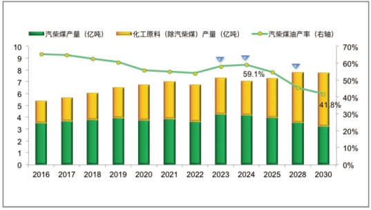 图3:2016-2030 年中国汽柴煤、化工原料产量及汽柴煤油产率变化趋势。数据来源:中国化工经济技术发展中心