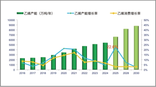 图4:2016-2030 年中国乙烯产能及其增长率、消费增长率。数据来源:中国化工经济技术发展中心
