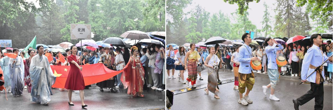 当天,由各国学生代表组成的巡游队伍拉开了世界文化节的帷幕。巡游队伍从北京语言大学东门出发,经过梧桐大道,向田径场行进。数百名中外学生身穿各具特色的传统服装,载歌载舞,尽显青春活力。