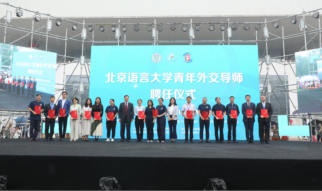 北京语言大学青年外交导师聘任仪式在世界文化节开幕式上举行,北京语言大学党委常委、副校长黄益方宣读北京语言大学青年外交导师聘任名单,北京语言大学党委书记倪海东、共青团中央国际联络部副部长刘凯为18名青年外交导师代表颁发聘书。学校通过建立青年外交导师库,在校内外广泛吸纳具有国际视野和专业能力的优秀人才担任青年外交导师,促进广大青年积极参与国际交往和国际传播,培养更多具有全球视野和世界眼光、能够参与各领域全球事务的青年外交人才。