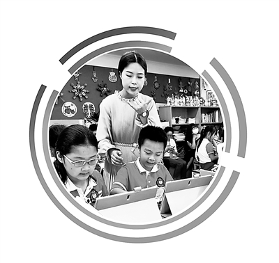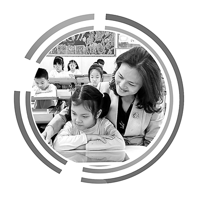 ①湖南省长沙市芙蓉区育英学校校长唐冬梅指导学生使用智慧课桌。范柳 摄