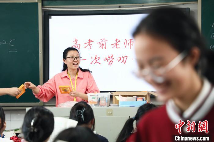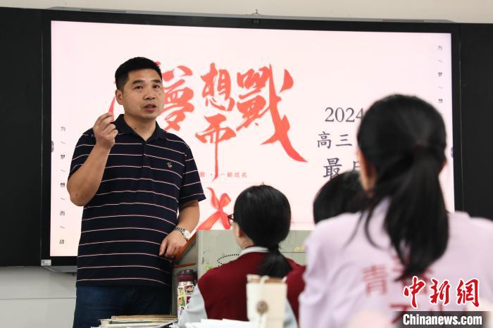 6月5日,在江西省南昌市第一中学高三年级的教室里,充满欢笑与祝福的高中“最后一课”生动上演,课堂上,有老师对学生的鼓励,也有学生对老师的感激,高三学子们在轻松愉快的氛围中结束了高中的“最后一课”,准备迎接高考。图为班主任正在为学生们上最后一节班会课。 刘思伟 摄