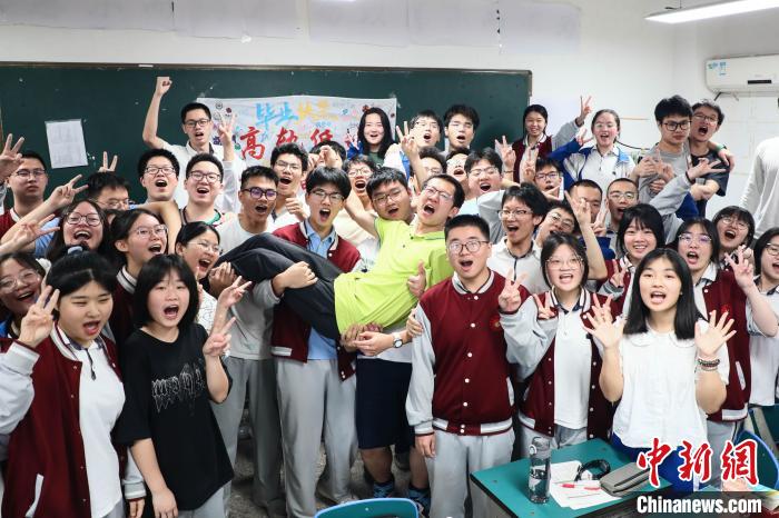 6月5日,在江西省南昌市第一中学高三年级的教室里,充满欢笑与祝福的高中“最后一课”生动上演,课堂上,有老师对学生的鼓励,也有学生对老师的感激,高三学子们在轻松愉快的氛围中结束了高中的“最后一课”,准备迎接高考。图为学生们将班主任举起庆祝高中毕业。 刘思伟 摄