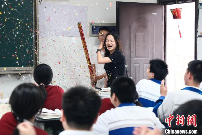 6月5日,在江西省南昌市第一中学高三年级的教室里,充满欢笑与祝福的高中“最后一课”生动上演,课堂上,有老师对学生的鼓励,也有学生对老师的感激,高三学子们在轻松愉快的氛围中结束了高中的“最后一课”,准备迎接高考。图为学生们正在与老师拥抱道别。 刘思伟 摄