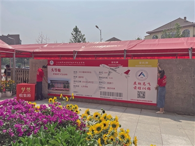 “2024高考加油”“高考就是高高兴兴地考试”“保持静心,增强信心,做题专心,考试细心”……考生一进考点,就可以看到这些鼓舞人心的标语。走出考点时,一张巨型“圆梦号”头等舱登机牌映入学生眼帘,祝福考生们展翅高飞,前程似锦。