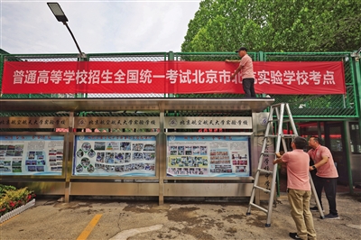 6月6日,记者在北京航空航天大学实验学校中学部(简称“北航实验学校”)考点看到,学校西门处已悬挂起高考考点横幅、考场布置已就位,校园内放置了多个温馨的提示语标牌。据悉,该校是今年新增高考考点之一,承接来自9所学校277名考生的高考组考任务。此外,记者还探访了北京高考人大附中经开学校考点