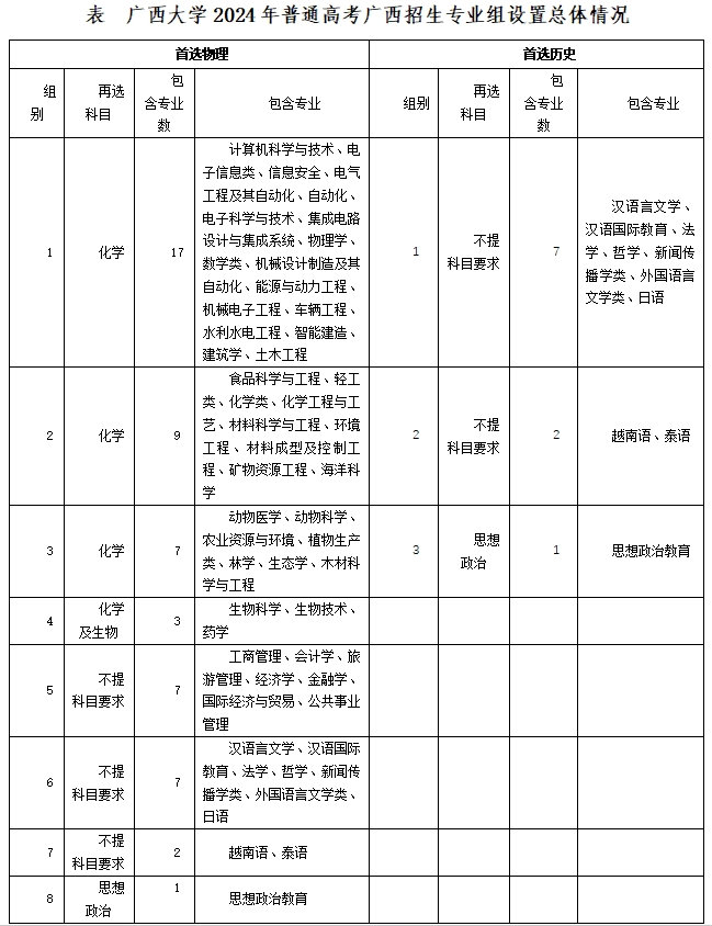 广西大学2024年在其他实施高考综合改革省份的招生专业组设置与往年一致。