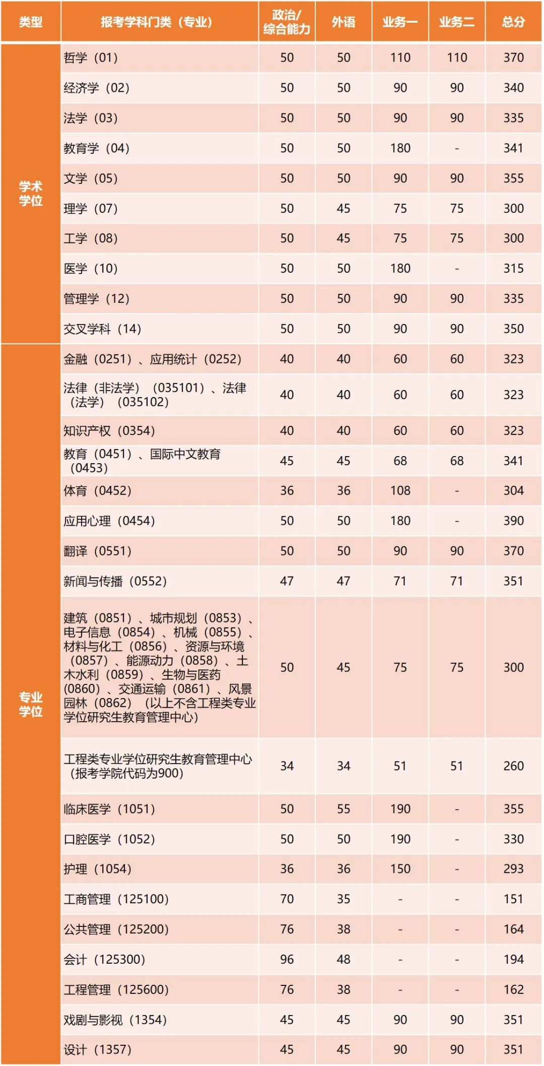 1.上表为我校复试基本分数要求,生源充裕学院可根据整体考试情况、招生计划、学科专业特点等,上调分数要求,但差额复试比例一般不得低于120%,报考该类学院的考生须达到学院公布的复试分数要求才能参加复试。
