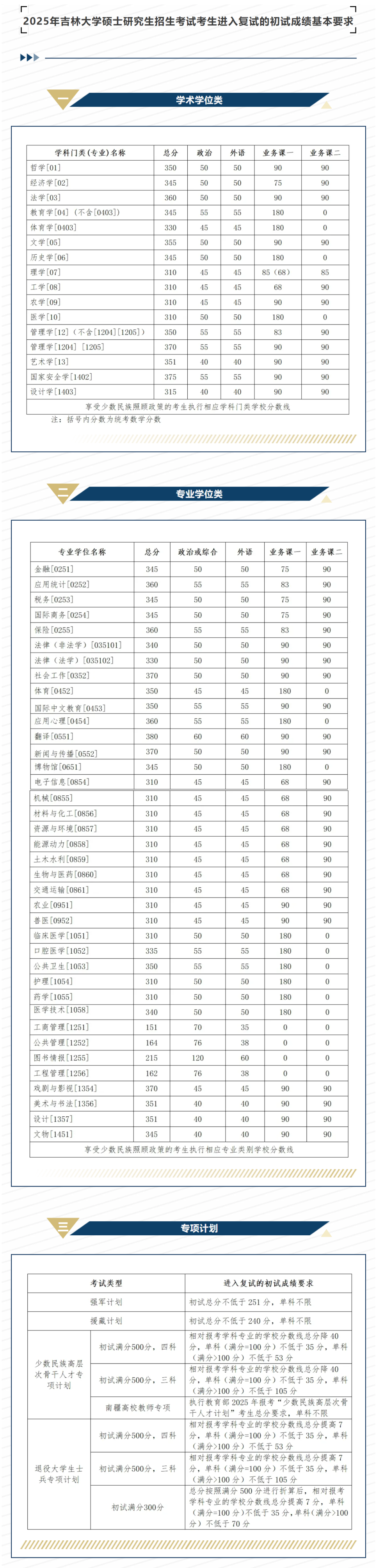 根据教育部相关文件精神,结合我校实际情况,经学校研究决定,我校2025年全国硕士研究生招生考试考生进入复试的初试成绩基本要求如下: