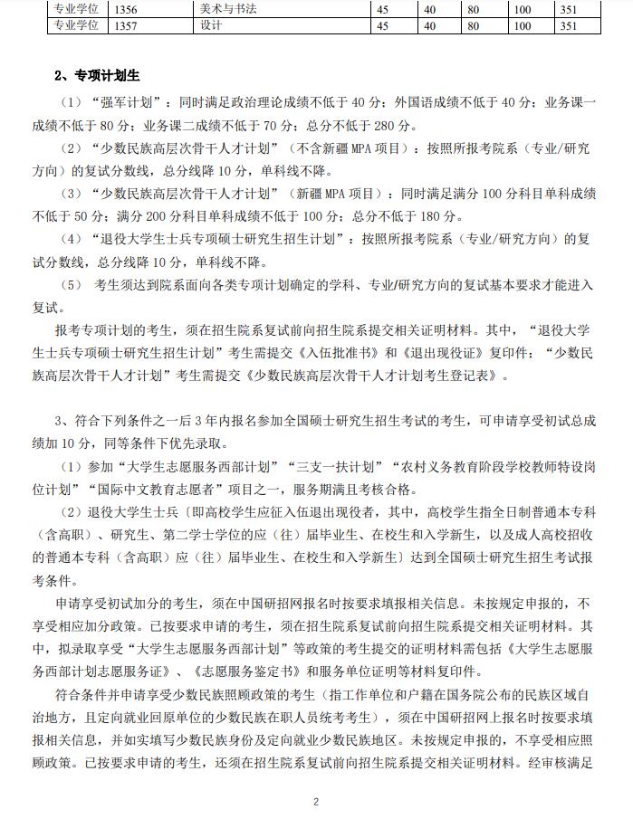 2、符合教育部《2025 年全国硕士研究生招生工作管理规定》第二十二条规定中“大学生志愿服务西部计划”“三支一扶计划”“农村义务教育阶段学校教师特设岗位计划”“国际中文教育志愿者”项目之一,服务期满且考核合格者,以及高校学生应征入伍退出现役等加分政策,执行初试总分加分照顾政策。