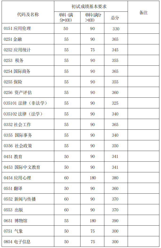 其中面向西藏地区“公共管理人才培养计划”专项,满分100分的单科成绩不低于40分、满分200分的单科成绩不低于90分、总分不低于160分;面向新疆喀什地区医学硕士专项,总分不低于235分,各单科成绩不作要求。