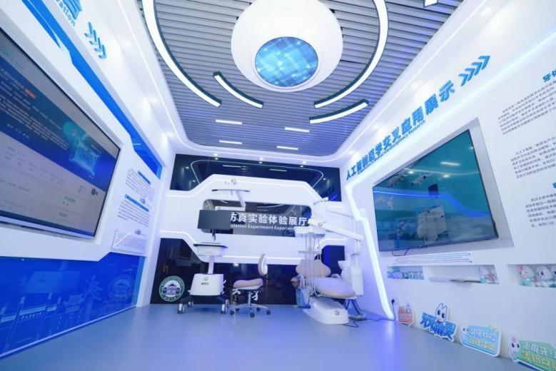 观摩展览采用“4+1”展示模式,“4”:四大板块依次为智慧教育新场景、智慧教育新理念、智慧教育新基建、智慧教育新范式;“1”为一个中央互动区,以此展示人工智能赋能高等教育的教学变革与创新。新场景展位的武汉大学“AI手术室”,武汉科技大学“智能筑砌机器人平台”、武汉音乐学院“数智编钟沉浸式演奏教学体验”等展示引人驻足,新基建展位呈现的华中科技大学“数字孪生校园”、武汉理工大学“数据驾驶舱”、华中师范大学“小雅”平台等数字应用精彩异常;新理念、新范式则主要展示高校在深化数智教育改革、培育未来数智人才等方面的特色做法。
