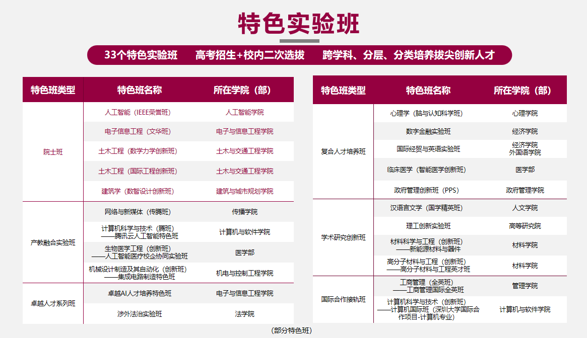2025年,新增4个特色班高考直招,分别为:建筑学(数智设计创新班)【院士班】;网络与新媒体(传腾班);心理学(脑与认知科学班);汉语言文学(国学精英班)。其中,网络与新媒体(传腾班)为深圳大学与腾讯合作共建,深度融合腾讯AI课程体系,引入真实产业项目驱动实践。心理学(脑与认知科学班)全新打造“心理学+认知神经科学+人工智能”跨学科培养体系。汉语言文学(国学精英班)作为深圳大学首个文科特色实验班,已办学十二载,2025年首年列入高考招生。
